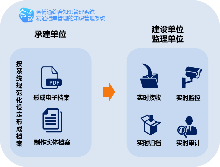 工程項(xiàng)目檔案基本都是使用以往事后歸檔的檔案管理方法,在工程結(jié)束時(shí)才對(duì)工程檔案進(jìn)行審計(jì),很多時(shí)候并沒有體現(xiàn)出工程項(xiàng)目的全貌,形成一種工作量大、周期長(zhǎng)、易出錯(cuò)的工作流程。采用會(huì)博通后,給承建單位一個(gè)可實(shí)時(shí)歸檔工程成果文檔的平臺(tái),建設(shè)與監(jiān)理單位可以在系統(tǒng)中實(shí)時(shí)監(jiān)控項(xiàng)目資料的到位情況,先審查電子文檔,再對(duì)實(shí)體檔案進(jìn)行比對(duì),實(shí)現(xiàn)實(shí)時(shí)歸檔管理。